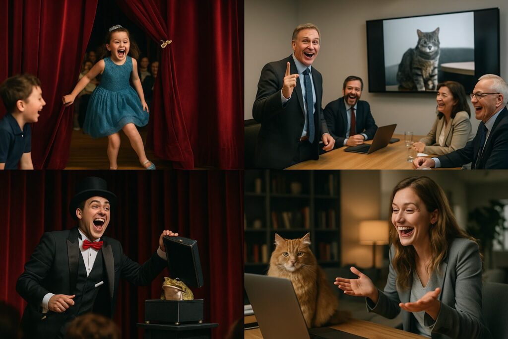 • 魔術ショーで「ウサギが箱からappearします!」と宣言したら、本当に出てきたのは近所の子供が入れていたカエルで観客が大爆笑。