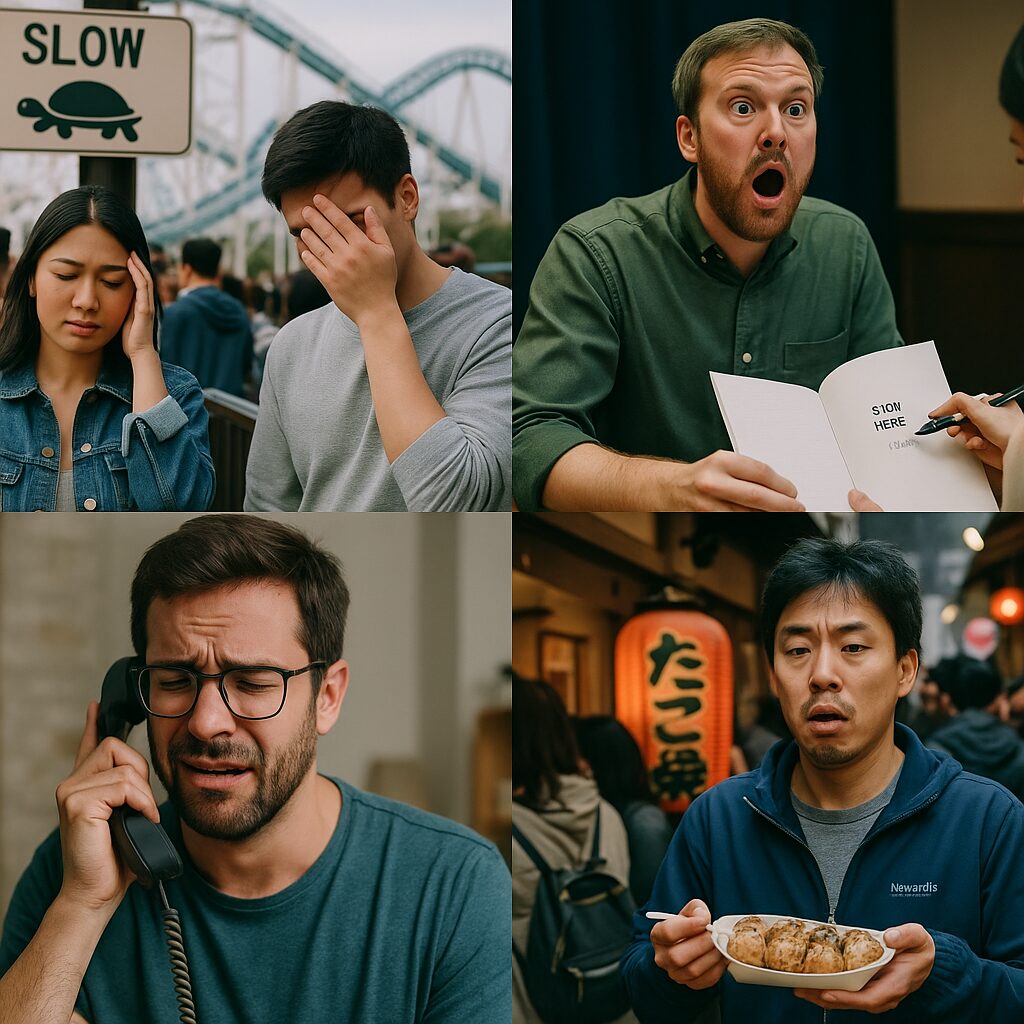 • 遊園地で2時間もlineに並んだのに、やっと乗れたジェットコースターがまさかの「点検中」で止まっていて、スタッフに「またlineの最後尾からお願いします」と言われて泣きそうになった。