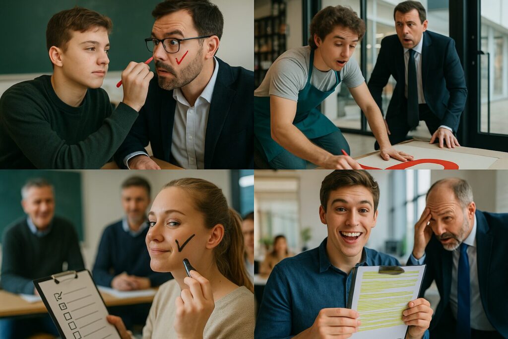 - テストで「正しい答えにmarkをつけなさい」と言われた生徒が、なんと「先生の顔」に丸をmarkして「先生が正解だと思いました!」と真顔で提出して全員爆笑。