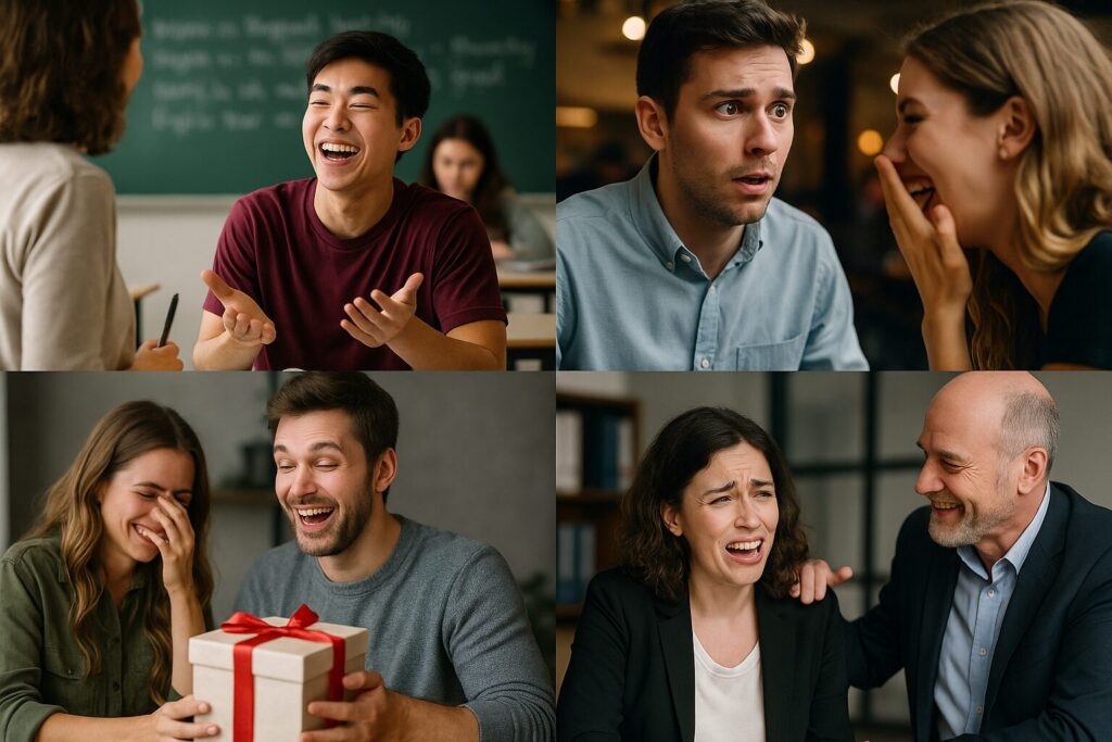 • 上司に褒められて「Working with you is a pleasure!」と自信満々で言ったら、緊張で噛んで「Working with you is a pressure!」になり、上司が「やっぱりな…」と笑いながら肩をたたいてきた。