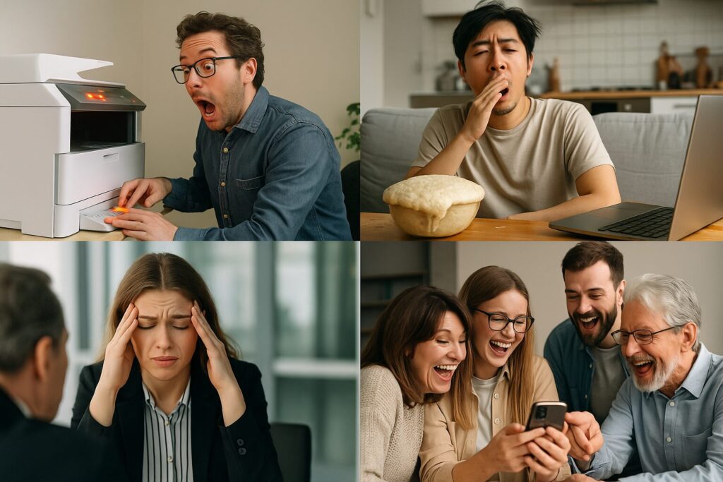 • スマホの初期設定processを家族で協力して進めたら、全員が同時に別のボタンを押して設定がリセット。結局、最初の画面に戻って笑うしかなかった。