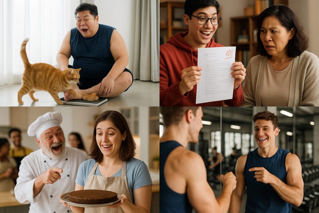 ダイエットのresultを友人に見せようとして、体重計に乗った瞬間、猫が飛び乗ってきて数値が+5kgになり、「努力のresultが台無しだ!」と叫んだ。