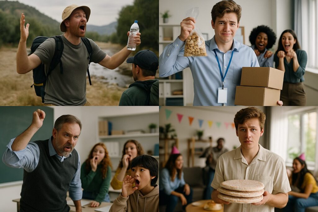 - 学校の理科実験で先生が材料をsupplyし忘れ、「今日は想像力で反応を観察しましょう」と言い出し、全員が空気に向かって「ボンッ!」と擬音を叫んで終わった。