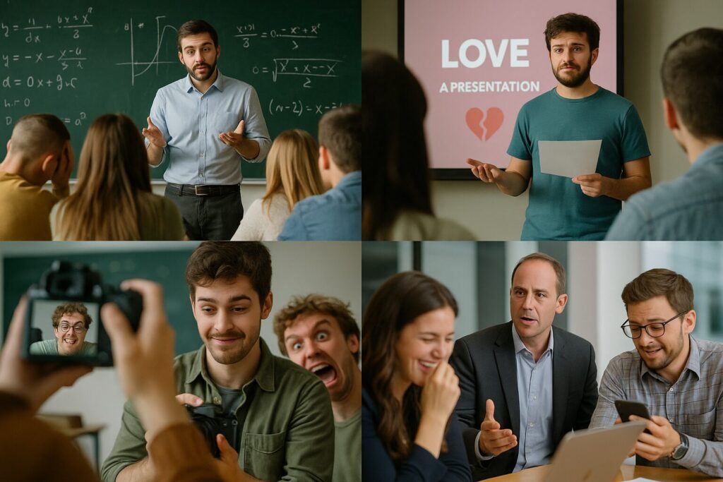 友達が「恋愛をsubjectにしたプレゼン」をすると言い出したが、スライドがすべて自分の失恋エピソードで構成されており、最後に「まだ立ち直ってません」で終了。
