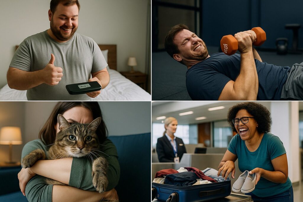 空港で荷物のweightオーバーを指摘され、慌てて中身を減らしたが、なぜかスリッパだけを取り出して満足げに笑っていた。