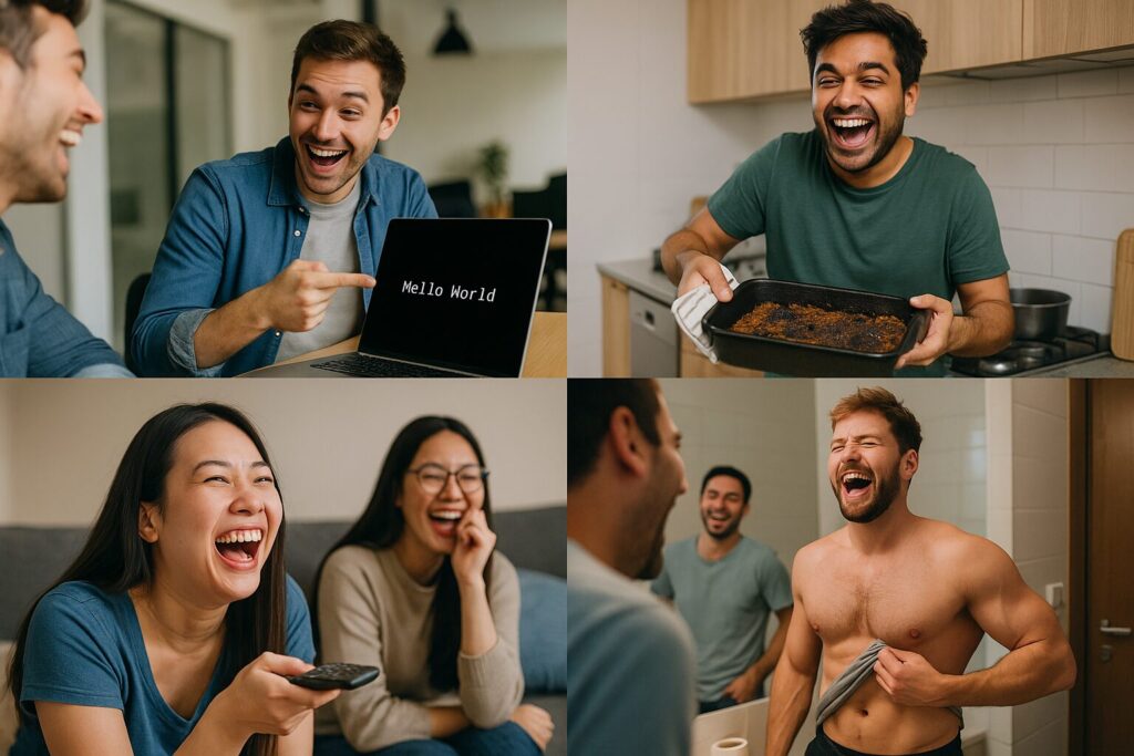 - 筋トレで体をdevelopしようと毎日鏡をチェックしていた友人。1週間で「腹筋割れてきた!」と喜んでいたけど、実はシャツのシワだったと気づき、爆笑の渦に。