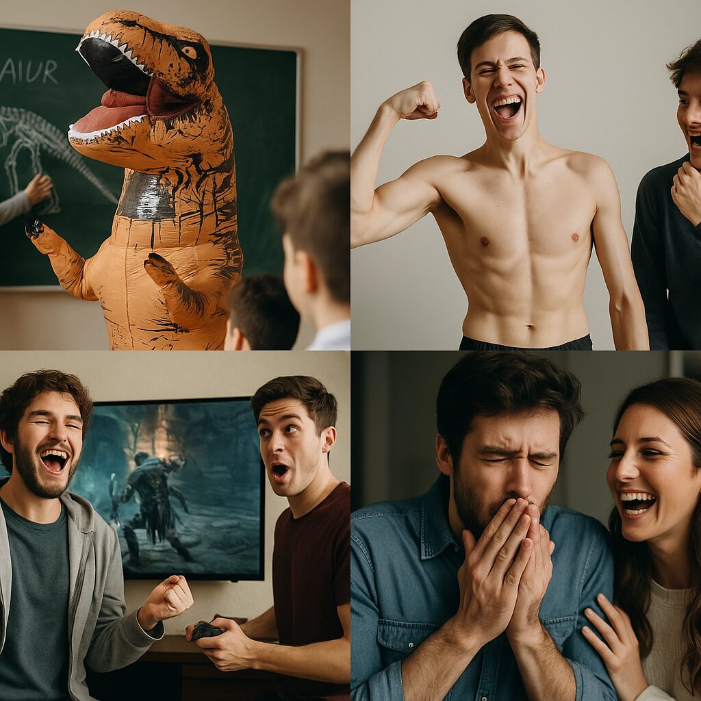 - 学校の授業で先生が「恐竜はもうexistしない」と真面目に説明していたのに、クラスの子が恐竜の着ぐるみで突然登場し、「いや、ここにexistしてるぞ!」と叫んで大爆笑。