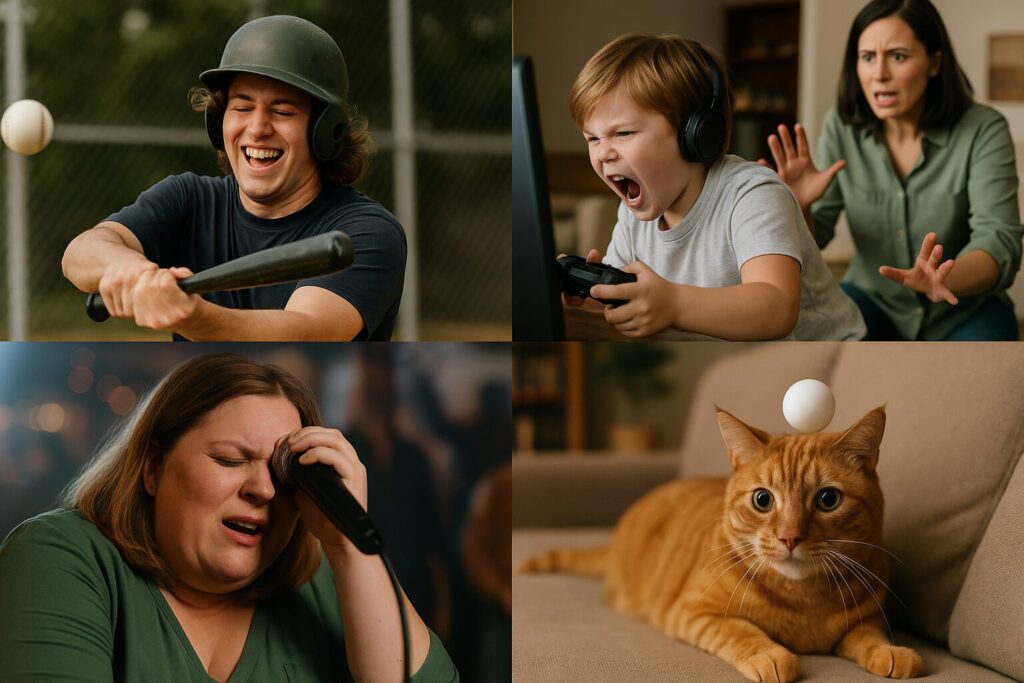ピンポン玉を思い切りhitしたら、隣で寝ていた猫の頭にコロコロ直撃、猫が「にゃっ!」と飛び上がって全員大爆笑。