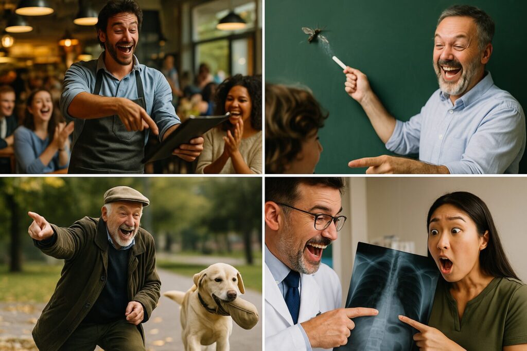 授業中に先生が黒板の答えをindicateしようとしてチョークで指したら、誤って隣のハエをつぶしてしまい、クラス中が大爆笑。