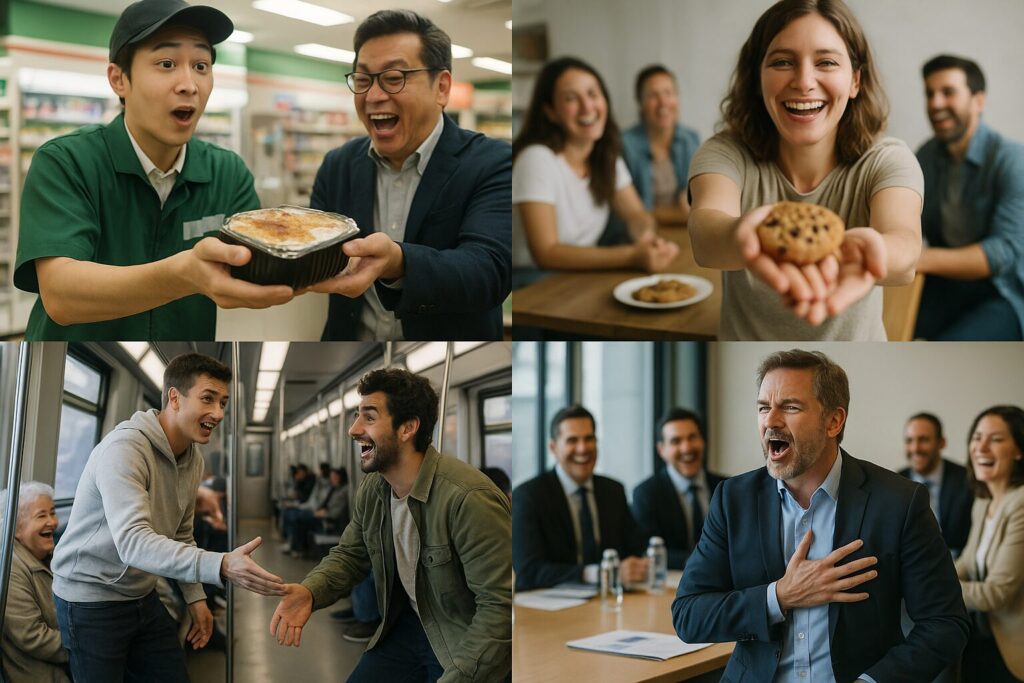 コンビニで新人アルバイトが、客に温めたお弁当を落としてしまい、慌てて床から拾い上げ「I offer you this one free!」と真顔で差し出して、客も店長も大爆笑。