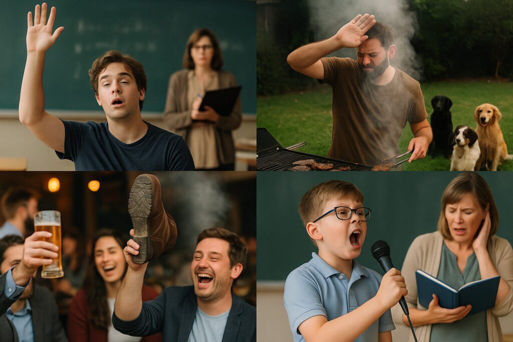 授業中に先生が「質問ある人?」と聞いた瞬間、居眠りしていた友達が寝ぼけて思わず手をraiseしてしまい、クラス中が爆笑。
