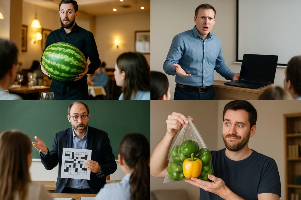 学校で先生が「私は生徒に知識をprovideする」と真剣に言ったのに、実際に配ったのはなぜか自作のクロスワードパズルだった。