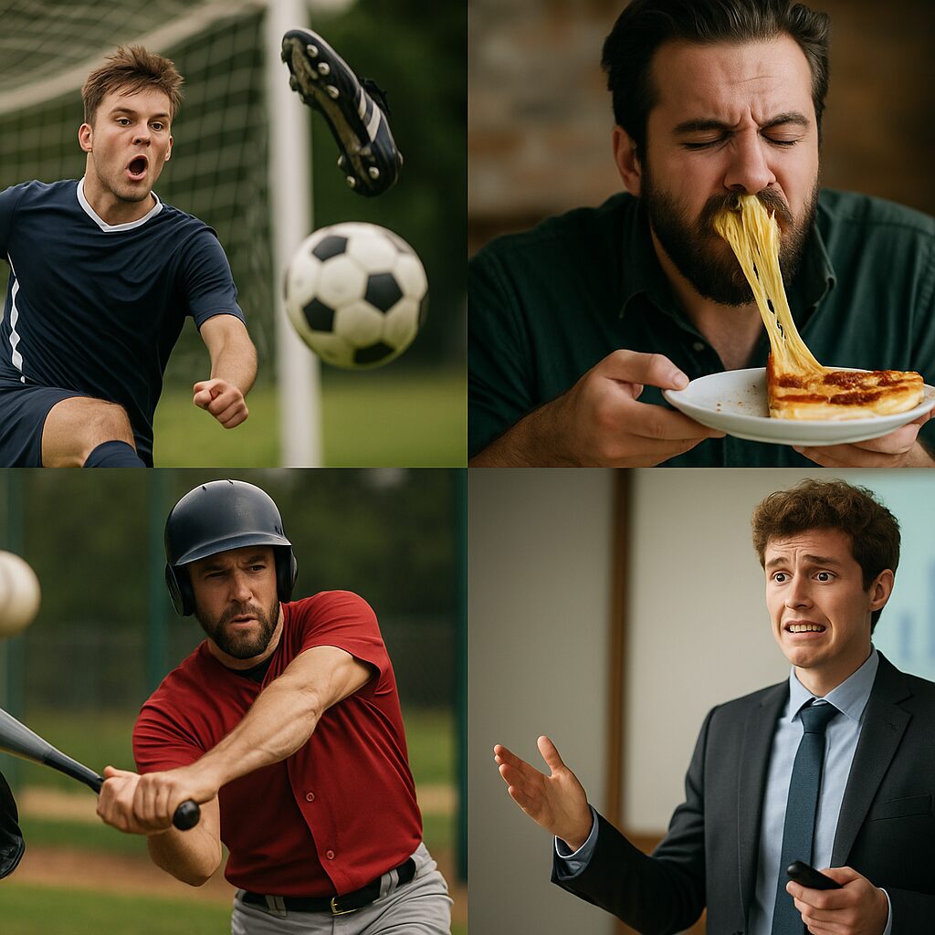 ピザを食べているとき、友達がチーズを引っ張りすぎて顔にベチャッとくっつき、「これは胃袋に直接strikeしたな!」と苦しそうに叫んだ。