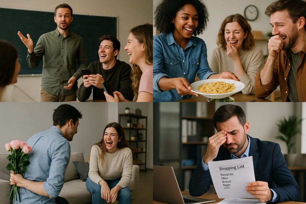 彼女にサプライズを仕掛けようとして「彼女は部屋にいないと suppose してる」と言いながら入ったら、まさかの本人がソファで待っていて全員爆笑。