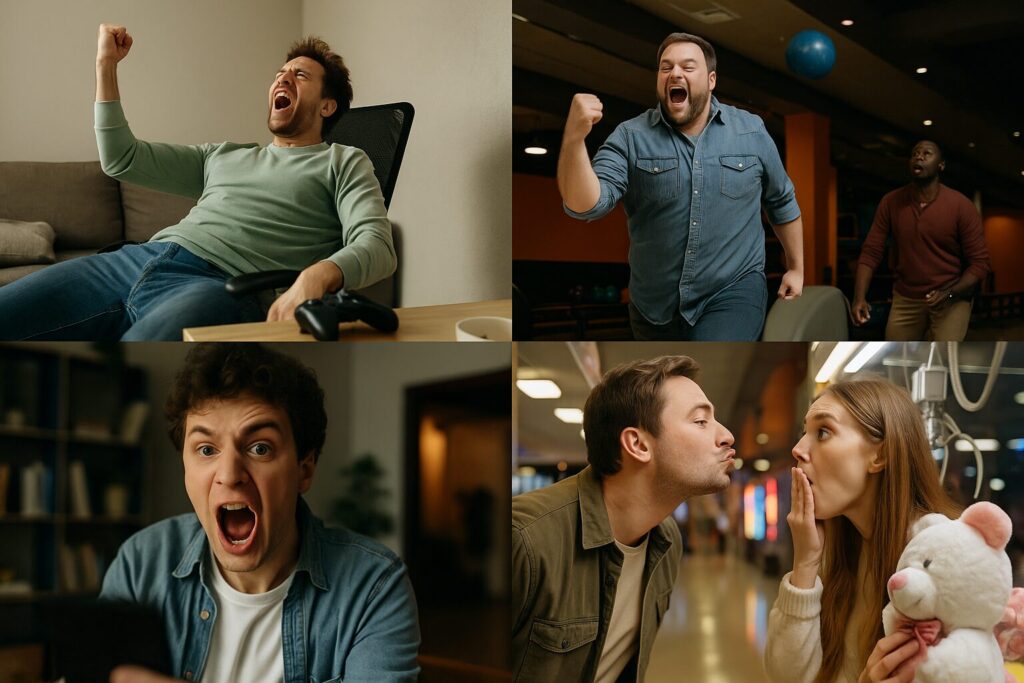 上司とのボウリング対決で奇跡的にwinしたが、調子に乗ってガッツポーズした瞬間、指がボールに引っかかって天井に向かって投げてしまった。