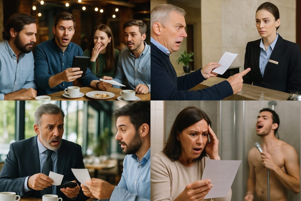 - レストランで友人がかっこつけて「I’ll take the bill!」と言ったのに、財布を忘れていて全員で沈黙。結局みんなで割り勘にして、彼は「心だけはおごった」と言い訳した。