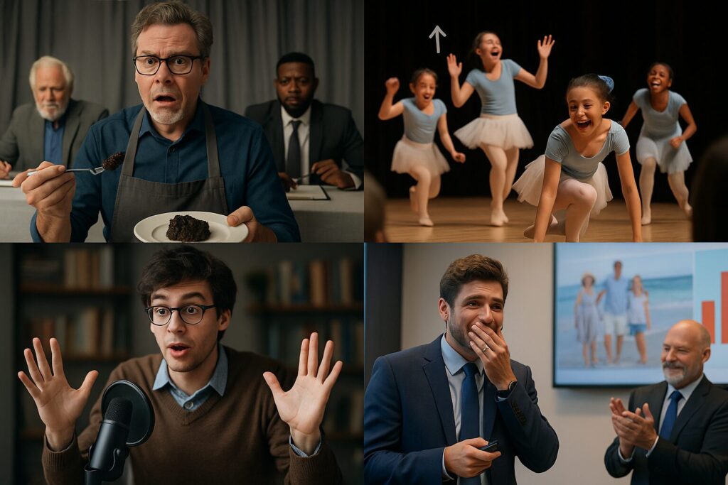 • 会社の「cooking competition」で、上司が塩と砂糖を間違えてケーキを作り、審査員全員が一口で顔をしかめて沈黙。次の瞬間、「これは新しい味覚の挑戦だ!」と苦笑いしながら拍手が起こった。